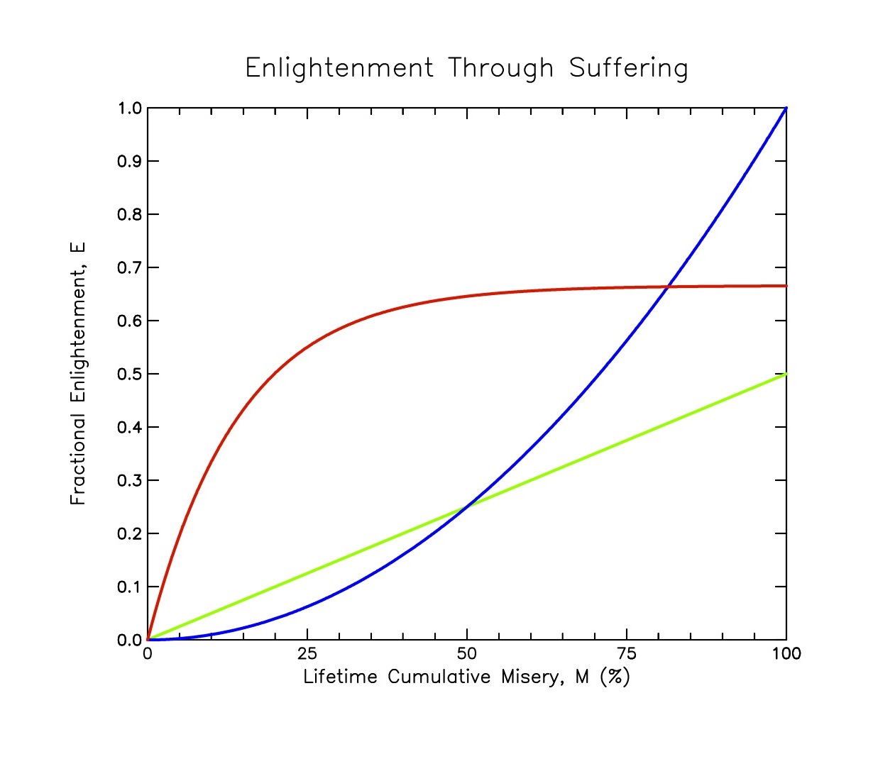 Finally, a sad case, Mr. Red. He started out gangbusters. Every time he was miserable he took a big leap forward, enlightenment-wise. Just look at how steep that curve is! But then something happened. Somewhere around halfway through his life’s quotient of misery, progress stopped. It seemed like no matter how much he suffered, nothing improved. He seems destined to accumulate the other half of the misery that is surely coming his way, and have to settle with 2/3 enlightenment. Even if Mr. Red massively increases the total misery in his life, say through engaging in elective misery, he’s stuck.