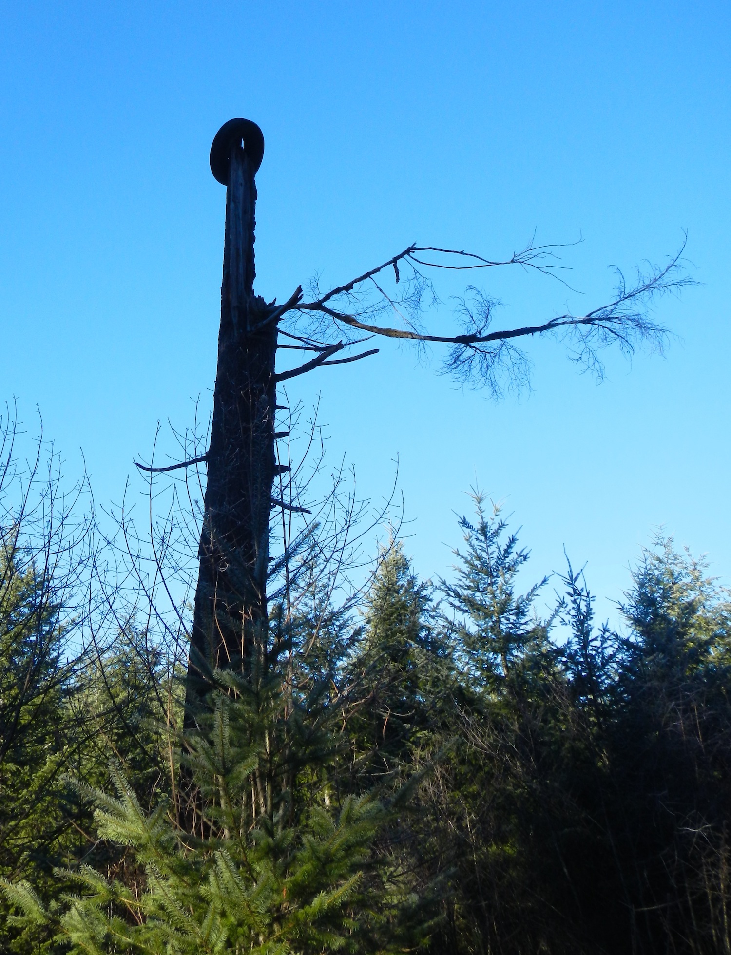 The first turning point (to the right) was marked by a spectacular example of art logeaux, most commonly manifest as big rocks balanced on tree stumps, but here, unusually, by a tire hoist upon a snag.