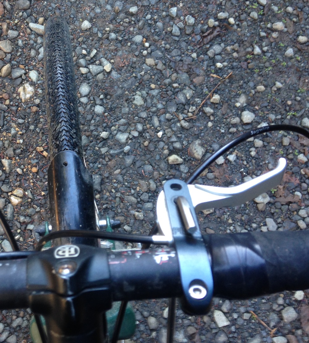 As so often lately, they had a beautiful day, 22 degrees in Philomath and bright. This time TLRC drove and got his nonfat latte from Hooters. Up past Hoskins they found a suitable sunny spot, parked, suited up and hustled up the icy road. A mechanical glitch held them for a bit. D., who is a crackerjack bike mech has lately been less than fastidious about his maintenance and has been plagued by minor problems. There are reasons for this that are best not dwelt upon here. This morning the circlip and post fell out of his Paul top lever which distressed him no end. TLRC empathized, but empathy vanished in the face of sheer mechanical aptitude: