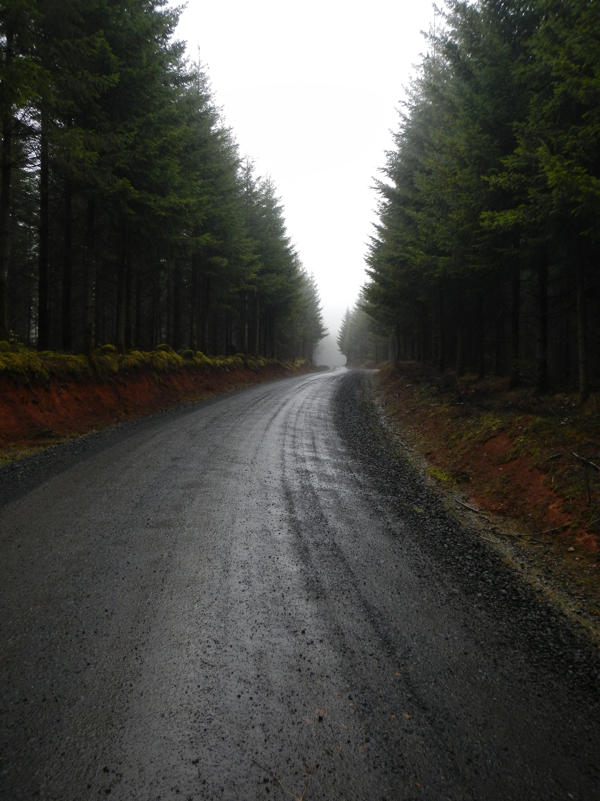 By this time, clouds and heavy mists were wafting up from the Triangle, and visibility varied from a few hundred feet to a few hundred yards. The road seemed “main” enough, fresh rock and new mileage signage, but no interpretable numbers (i.e. BLM ones to match his map). TLRC found the first major intersection, but the left-hand choice didn’t seem “main” enough so he stayed on the “main” road, looking for the next obvious, right-angled intersection. The next one didn’t look at all like it would do, so TLRC stayed on the “main” road, and found himself dropping rapidly into god-knew-where, all sense of direction evaporated and getting more chilled to boot. As the “main” road continued to descend and split into smaller and less “main-looking” spurs, it was becoming pretty “obvious” that TLRC was not going to make the ride, and the sooner he “anticipated” this and got out of the steady rain, the warmer he would be in the end.